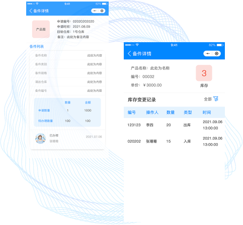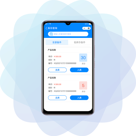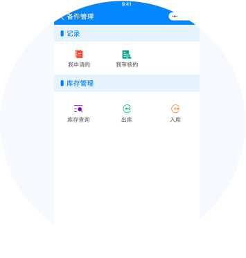 服务人员可以在移动端查询库存、 申领备件,获得备件后在个人备件库 关联工单使用。