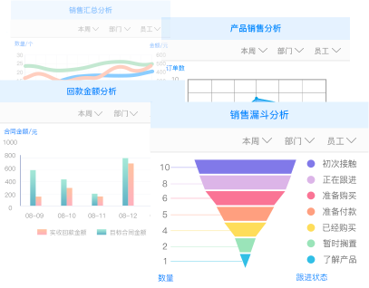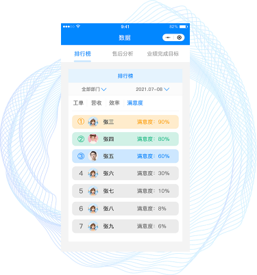 基于人、事、物、服务多个维度的数据整合及 深度分析,智能生成数据报表,为管理者优化 决策提供数据支撑,改善企业服务质量,提升 客户满意度。